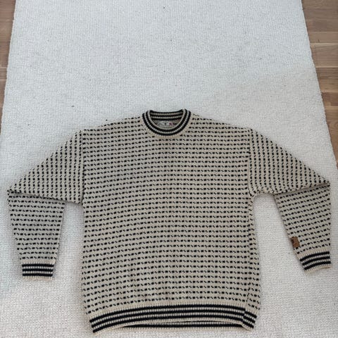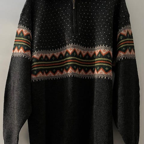 Miesten käsinneulottu tummanharmaa villapaita, jonka koko on noin XXL. Vasemmassa hihassa on yksi parsittu kohta.