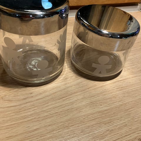 Mukeissa metallipidike ja niissä lasi. Yhteensä 50€ tai tarjoa. Hesassa ovat