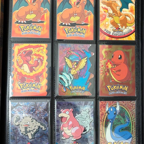 Hyväkuntoisia Pokemon Topps kortteja. Kaksi oikeassa reunassa olevaa ovat kiiltäviä.