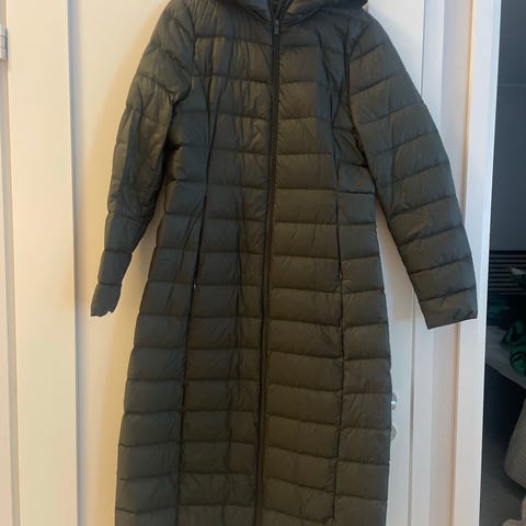 Vila naisten talvitakki, koko 38. Pitkä, vihreä toppamallinen takki, jossa korkea kaulus ja etuvetoketju. Materiaali päällinen on polyesteriä, täyte on untuvaa ja höyheniä. Takissa on sivutaskut ja tikattu pinta. Soveltuu kylmän sään ulkoiluun ja arkipukeutumiseen.