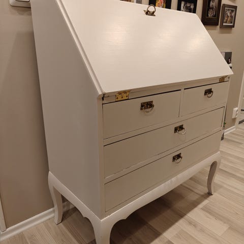 Kaunis, ikäisekseen hyväkuntoinen, kotimainen lankahylly 1950-1960-luvulta Jorma Valve Vakiopuu. Kuusi koivupuista hyllyä, metalliset kannattimet, tummat tukipuut. Korkeus 198 cm, hyllyn pituus 81 cm, leveys 21 cm. Yhden hyllyn päässä liimaus auennut n. 14 cm (viimeinen kuva), otettu huomioon hinnassa, muuten siisti kirjahylly. Kuvan kirjat eivät kuulu kauppaan. Ainoastaan nouto.