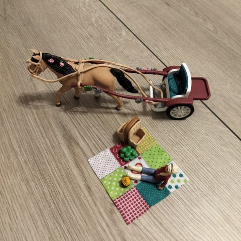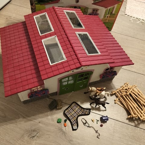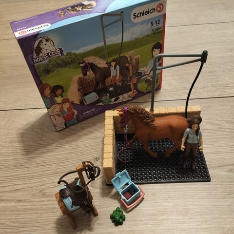 Myydään Schleich näyttelypaikka. Hyvässä kunnossa. Muutamia koristeita puuttuu, kuten rusetteja ja meikkilaukku, mutta kaikki oleellinen tallessa.