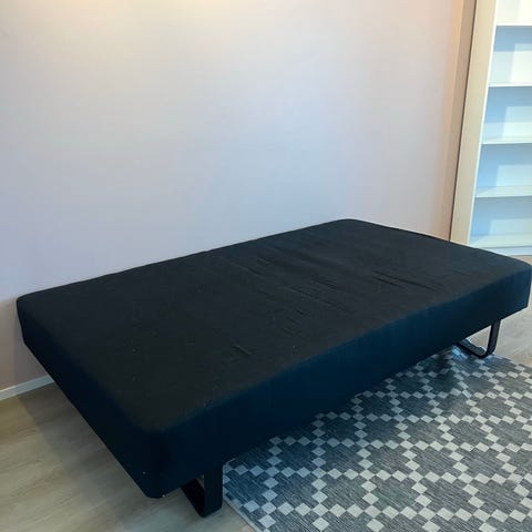 120 cm leveä sänky. Yksi pettänyt jalka ruuvattu aikoinaan takaisin kiinni runkoon.