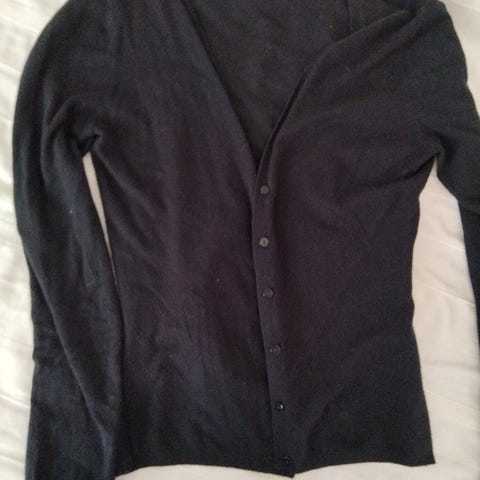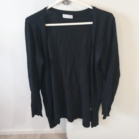 Naisten villatakki, koko S. Väri musta ja materiaali puuvilla. Pitkähihainen malli, jossa resorit hihansuissa ja helmassa. Napit edessä.