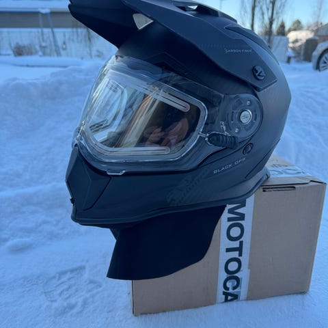Joutilaana uutta vastaava kypärä sähkövisiirillä, takavalolla ja Cardolla... tällä voipi kuunnella musiikkia puhelimesta ja soittaa puheluita kypärä päässä.