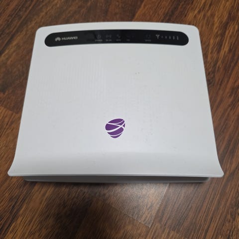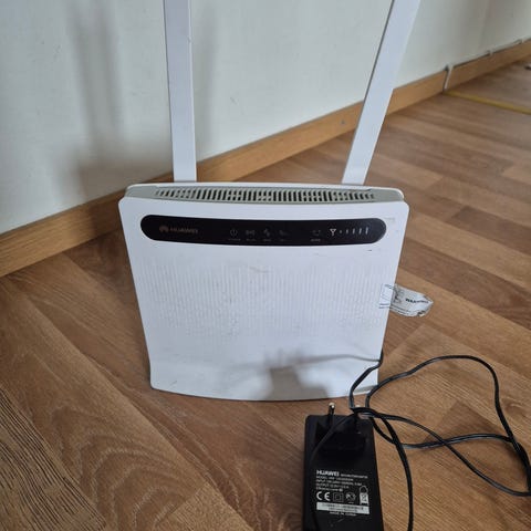 Huawei CPE B593 reititin. Laite sisältää kaksi ulkoista antennia ja useita Ethernet-portteja langallista yhteyttä varten.