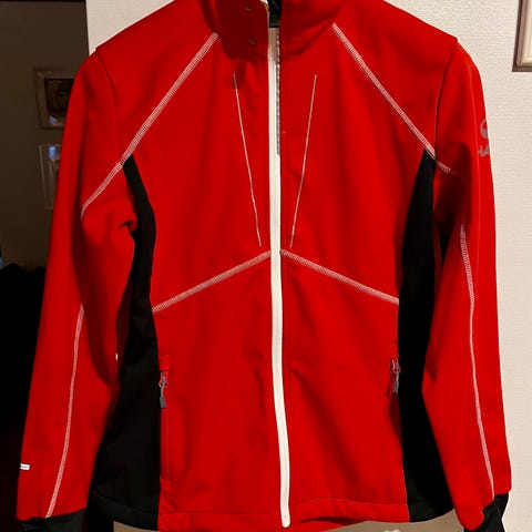 Noname hiihtotakki, koko S. Värit punainen, keltainen ja musta. Edessä täyspitkä vetoketju ja kaksi vetoketjullista sivutaskua. Takana musta joustava paneeli ja heijastinnauha yläosassa. Hihansuissa joustoresori. Sopii esimerkiksi ulkoilu- tai urheilukäyttöön viileämpiin keleihin.
