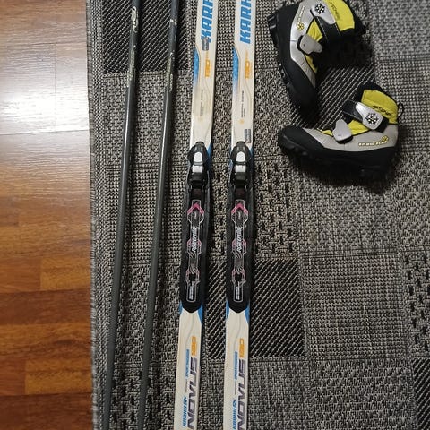 Lasten suksisetti 130cm, sauvat 90cm ja monot 30