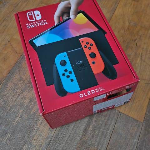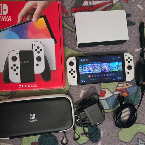 Vähän käytetty Nintendo Switch OLED -pelikonsoli valkoisilla Joy-Con-ohjaimilla.