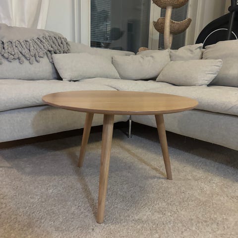 Myydään sohvapöytä, pöydän pintaan tehty uusi maali ja lakkaus. Alkuperäinen pinta ruskea. Pöydän levy on tammiviilua, tuunattu koska pinta oli huono. Oikea väri näkyy vikassa kuvassa