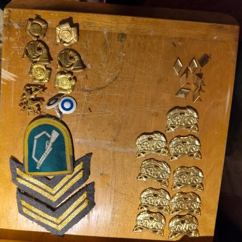 Ylhäällä luutnantin merkit: Puola, Irlanti ja kaksi ranskalaista. Keskellä Italian sotilaspoliisi ja Ranskan maatunnus.