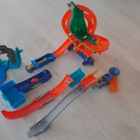 Annetaan autorata. Oranssit osat ovat käytössä pehmenneet/vääntyilleet, välillä pikkuautot kulkevat monta kierrosta, välillä tippuvat radalta kesken kierroksen. Nouto Riistavedeltä tai kulkeutuu myös Kuopioon.