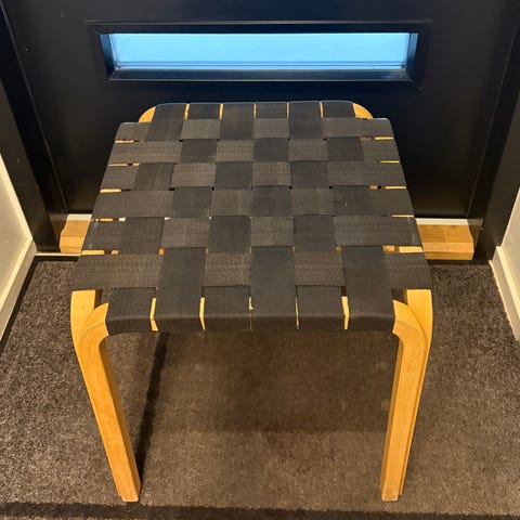 Tyylikäs laadukkaalla seepra kankaalla verhoiltu ja kevyesti pehmustettu jakkara. Ei Artek Alvar Aalto jakkara vaan ihan joku muu. Nouto Hgin Vallilasta.