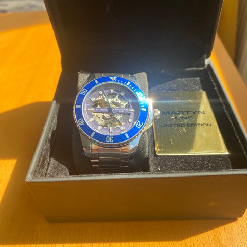 Martyn Line Limited Edition -unisex-rannekello. Hopeinen ranneke pyöreällä kellotaululla. Kellotaulussa on useita pienempiä näyttöjä ja punaisia yksityiskohtia. Kello toimitetaan laatikossa, jossa on Limited Edition -tarra. Sopii käytettäväksi unisex-rannekellona arkeen tai juhliin.