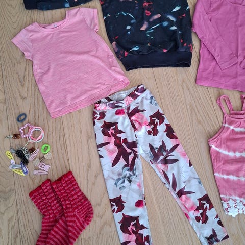 Lasten vaatepaketti, koko 110/116. Paketissa on useita erilaisia vaatteita, kuten t-paitoja, pitkähihaisia puseroita ja mekkoja sekä farkkuhenkselihame.