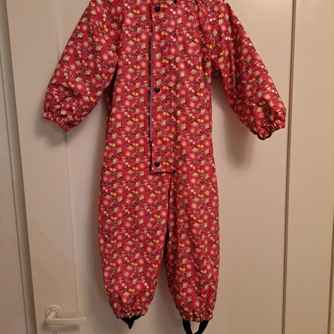 Käytettynä meille tullut Jonathanin fleecevuorillinen sadehaalari, kokoa 92. Polvet olivatkin jo kuluneet, päästävät läpi veden. Paikkaamalla varmasti saa vielä vedenpitäväksikin. Peppu vaikuttaa ehyeltä. Hihansuiden heijastinosat hieman kuluneet, hihat ja lahkeensuut muutoin hyvässä kunnossa. Samoin etuosassa oleva kapea heijastinnauha vetoketjun edessä hieman halkeillut. Pientä värjäymää, yleisilmeeltään siisti. Ei ehtinyt meillä käyttöön ollenkaan.