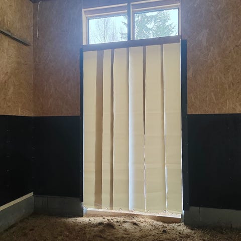 Tämä on helppo,edullinen ja toimiva ratkaisu hevospihatoille ja karjasuojille, Pvc-Suikaleverho.