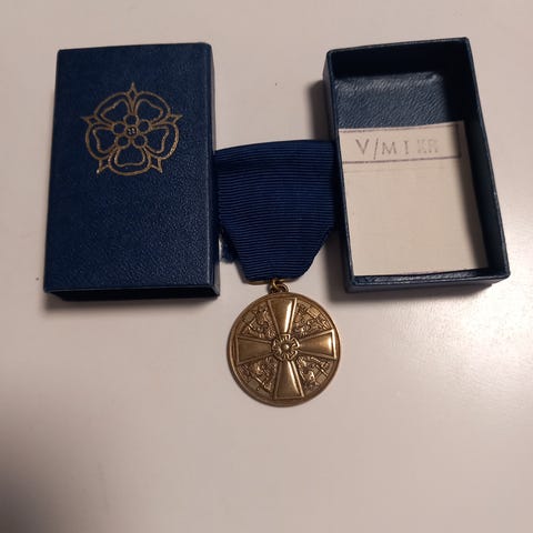 Myydään Suomen Valkoisen Ruusun ritarikunnan ansiomitali, virallinen valtiollinen kunniamerkki.