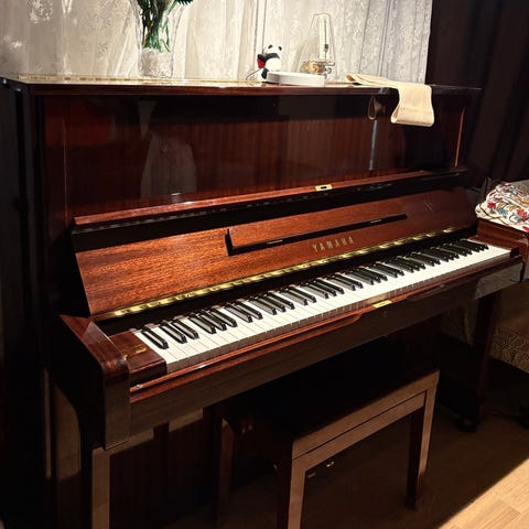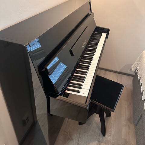 Akustinen valkoinen Yamaha M1 pystypiano. Soittimessa on perinteinen koskettimisto valkoisilla ja mustilla koskettimilla. Pianossa on sisäänrakennettuna elektroninen Genios silencer järjestelmä, jossa on näyttö ja säätimet esimerkiksi kuulokkeille, metronomille ja efekteille. Sopii kotikäyttöön ja harjoitteluun sekä akustisena että hiljaisempaan soittoon elektronisen järjestelmän avulla.