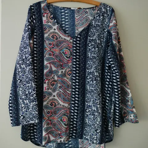 JDY paita, koko 38. Materiaalina polyesteri. Paidassa on kirjavan sävyinen kuosi ja pitkät hihat. Sopii käytettäväksi arjessa tai toimistopukeutumisessa esimerkiksi housujen tai hameen kanssa.