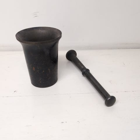 Kiva pieni mortteli se on metallia ja mielestäni messinkiä. Korkeus on 5 cm ja halkaisija on 9 cm ja sauva on 9,5 cm pitkä.
