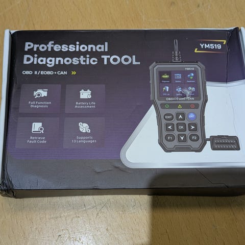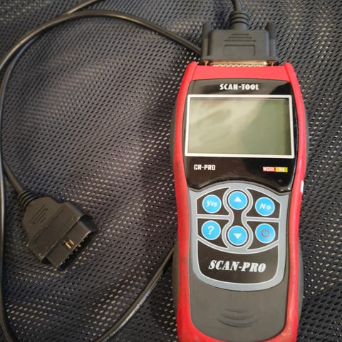 OBD2 vikakoodinlukija ajoneuvojen diagnostiikkaan. Laitteessa on näyttö vikakoodien lukemista ja poistamista varten.