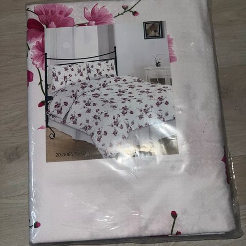 Aarikka pussilakana 150x 200 ja 3kpl tyynyliinat 50x60. Pussilakanassa ja tyynyliinoissa molemmin puolin eri väri. Pussilakanan yläreunassa pieni rispaantuma, jonka saa korjattua.