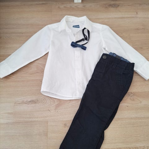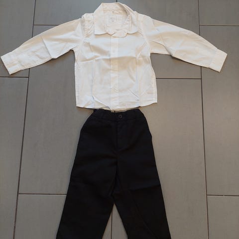 Myydään pari kertaa päällä pidetty poikien juhla-asu. Paita on 92cm ja housut 98cm