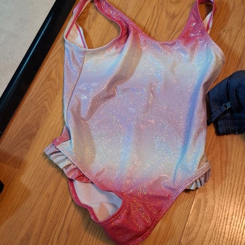 Neonpinkki uimapuku, vain paristi käytetty, kunnossa ei mitään moitetta. Sisäsaumoihin tarttunut pesussa tummaa väriä, näkyy kuvassa, ei näy päälle puettuna. Koko 130