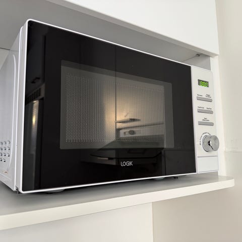 Toimiva mikro tuli mökkikaupan kylkiäisenä. En ole jynssännyt erityisillä aineilla. Sisäpuolella näkyy pieni kauneusvirhe.