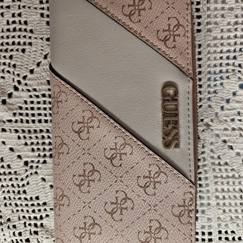 Guess naisten lompakko. Vaaleanpunainen, kuviollinen pinta ja metallinen Guess-logo. Lompakossa on vetoketjullinen ulkotasku sekä täyspitkä vetoketjusulku. Sopii korttien, setelien ja kolikoiden säilyttämiseen arjessa.