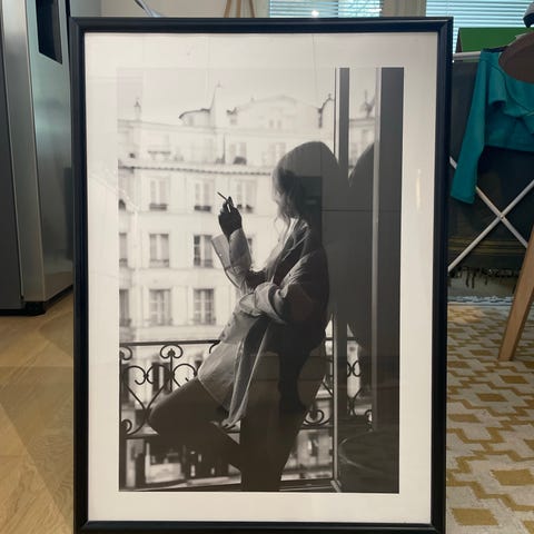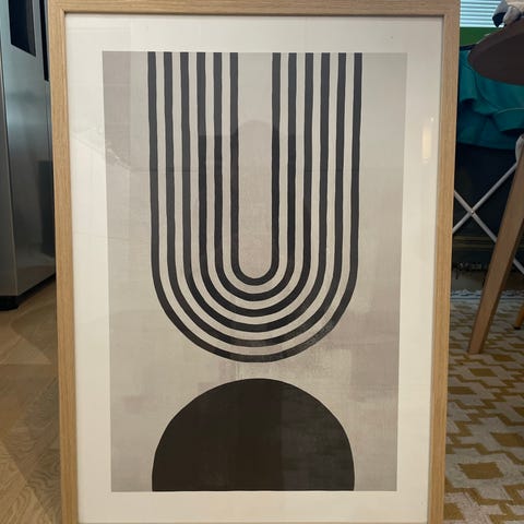 Graafinen seinäjuliste, jossa abstrakti ympyräkuviointi mustalla valkoisella taustalla. Yksi ympyröistä on korostettu vihreällä värillä. Juliste on kehystetty suorakaiteen muotoiseen, tummasävyiseen kehykseen lasilla. Sopii sisustuselementiksi esimerkiksi olohuoneeseen, makuuhuoneeseen tai työtilaan.