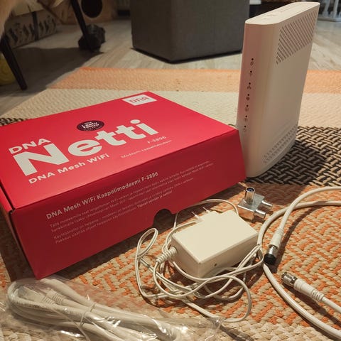 Sagemcom F-3686AC DNA kaapelimodeemi + TV-datajako + kaapeli. Kunto - kytketty ja toimii. En tarvitse sitä toisessa asunnossa.