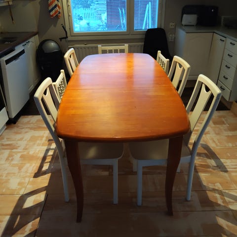 Kohtalaisen siisti ruokailuryhmä. Tuoleissa harmaa verhoilu, kaipaisi puhdistusta. Näppärä verhoilee tuolit uudelleen mieleiseensä kuosiin. Pöydässä pieni lommo ja muutamia kevyitä naarmuja. Eivät paljoa erotu eläväisestä pinnasta.