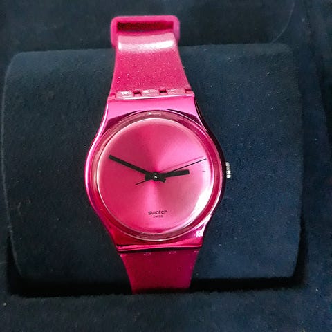 Hennon vaaleanpunaisessa Swatch PINKBAYA (GP403) -kellossa on katseet vangitseva muoviranneke ja yhteensopiva hohtava vaaleanpunainen kellotaulu, jossa on hyödyllinen päivämääräikkuna kello kolmen kohdalla.