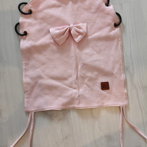 Vaunuverho / kuomuverho pupunkorvilla, vaaleanpunaista vohvelikangasta. Mukana viisi mustaa kiinnitysrengasta. Vain nouto.