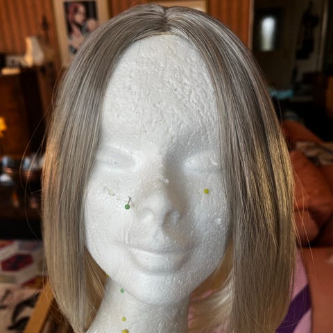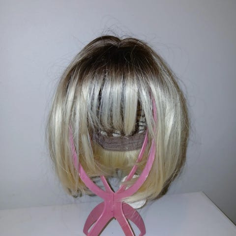 Lyhyt kaksisävyinen peruukki, jossa tyvi on tumman vaaleanruskea ja pituudet vaalean blondit. Malli on suorapintainen ja pituus noin leukamittainen. Sopii esimerkiksi arki- tai juhlakäyttöön, cosplayhin tai naamiaisasuun. Peruukki on säädettävä sopivan kokoiseksi.