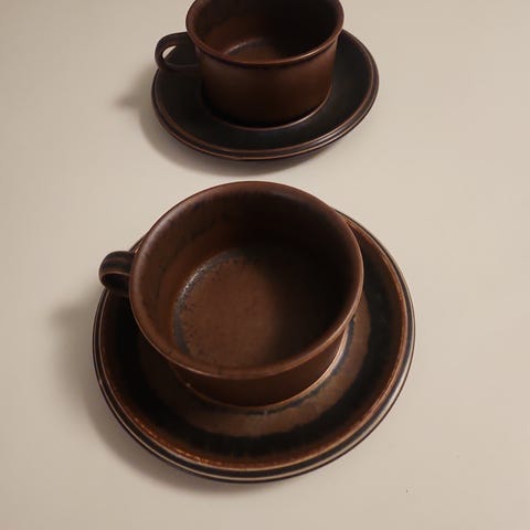 Arabia Ruska kahvikupit ja aluslautaset ruskeaa keramiikkaa.