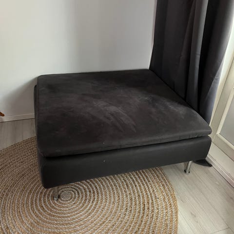 Rahiin on ostettu uusi päällinen (Ledje harmaa) reilu vuosi sitten, ja sen jälkeen rahia ei juuri ole käytetty eli se on lähinnä ollut sisustuselementtinä. Päällisen kunto on siis erittäin siisti. Päällisen kangasta ei löydy enää Ikean valikoimista.