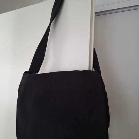 Marimekko olkalaukku, unisex-mallinen, käyttämätön. Materiaalina kangas, väriltään sininen. Laukussa on läppäkansi, joka suljetaan neppareilla. Etuosassa on useita avotaskuja pientavaroille. Sisäpuolella on vetoketjutasku ja avara päälokero. Säädettävä olkahihna mahdollistaa laukun kantamisen olalla tai poikittain. Soveltuu arkilaukuksi ja pientavaroiden kuljettamiseen.