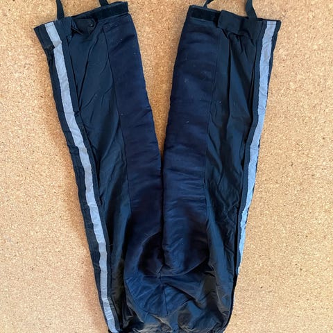 Koko 38/40, sivuissa vetoketjut, sisäreisissä vahvikkeet, henkselit