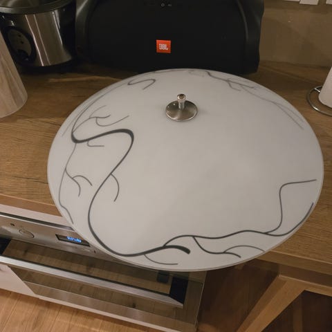 Pyöreä kattovalaisin, jossa mattapintainen lasikupu. Valaisimessa on metalliset kiinnikkeet kupua varten. Sopii yleisvalaisimeksi esimerkiksi keittiöön, eteiseen tai olohuoneeseen. Väri on vaalea, lasi läpikuultava, jolloin valo jakautuu tasaisesti huoneeseen.