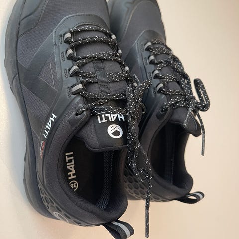 Naisten turvakengät, koko 38. Väriltään mustat punaisilla yksityiskohdilla ja punaisella sisävuorella. Päällinen näyttää olevan synteettistä tai nahkajäljitelmää, jossa vahvistetut saumat. Nauhakiinnitys ja matala varsi. Paksu, kuvioitu ulkopohja tarjoaa hyvän pidon. Soveltuvat esimerkiksi työ- tai suojajalkineiksi erilaisiin askareisiin ja ulkoiluun, kun tarvitaan tukevat ja suojaavat kengät.