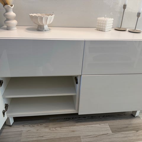 Hieno Ikean Bestå lipasto korkeakiiltovalkoisilla ovilla ja laatikoiden etusarjoilla sekä hopean värisillä metallijaloilla.