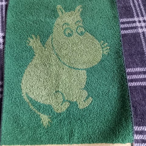 Muumiteemainen, iso käsipyyhe. Vihreä/beige Pikku Myy -kuosi.