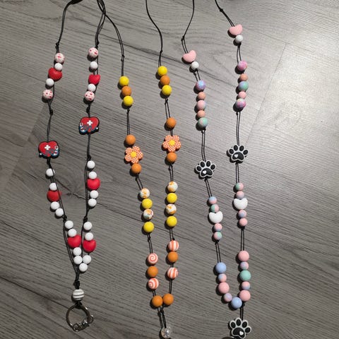 Avainkaulanauha puuhelmillä ja turvalukolla. Pituus noin 90 cm. Postitus onnistuu.