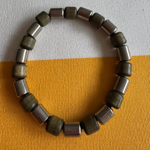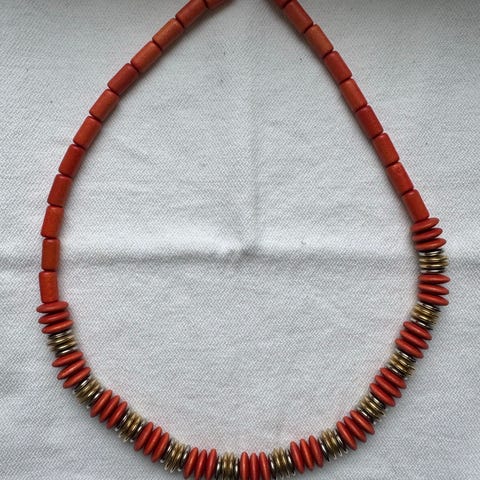 Aarikka kaulakoru naisille. Korussa on musta nauha ja kolme suurta puuhelmeä vihreän, punaisen ja keltaisen sävyissä. Erittäin hyvä kunto. Vintage.