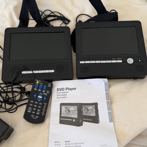 Myydään erittäin siisti ja täysin toimiva kahden näytön DVD-soitinsetti esimerkiksi automatkoille lasten viihdykkeeksi. Laitteet on testattu ja kaikki toimii kuten pitääkin.