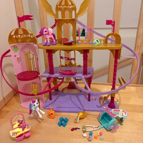 Hyväkuntoinen My Little Pony -elokuvaan perustuva Canterlot and Seaquestia -linna. "Canterlot meets Seaquestria". Iso, korkeus n. 73cm. Hissi ja muut mekanismit toimivat. Mukana hyväkuntoiset Spike the Pufferfish ja Queen Novo -figuurit. Suurin osa alkuperäisen paketin n. 30 lisäosasta tallella (puuttuvat: pinkki tuoli, pieni keltainen kala, pieni sininen varuste, violetti kaulakoru). Linnan rakenteista puuttuu yksi neljästä oikeanpuoleista tornia kannattelevasta ohuesta pylväästä (tornin katto pysyy kuitenkin paikallaan). Mukana ohjelehtinen, tarvittaessa mukaan saa myös alkuperäisen laatikon jossa kuvat varusteista (huom. kuvissa osa varusteissa on hieman eri värisiä kuin setissä). Merenneitolinna, ponilinna, meriponit. Hasbro 2016.