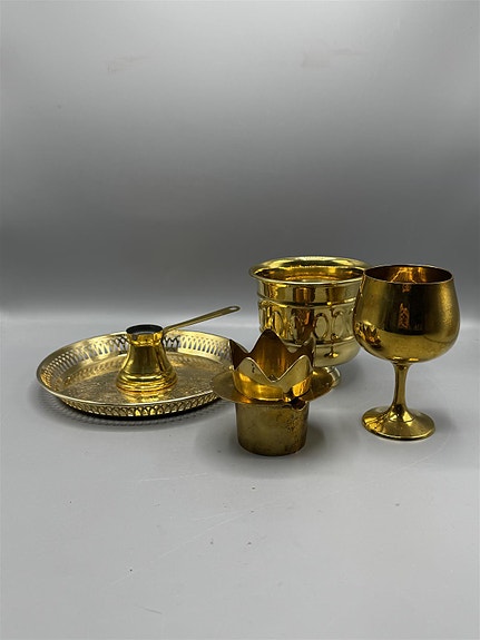 Messinkinen koristesetti, johon kuuluu kannu, pannu ja viisi kuppia. Setti on koristeltu kaiverruksilla ja siinä on perinteinen muotoilu.